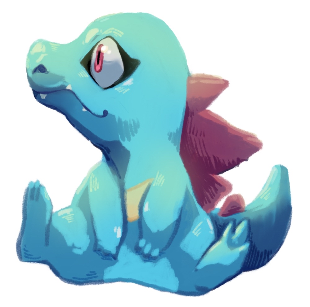 Totodile sitting on the ground, looking away.